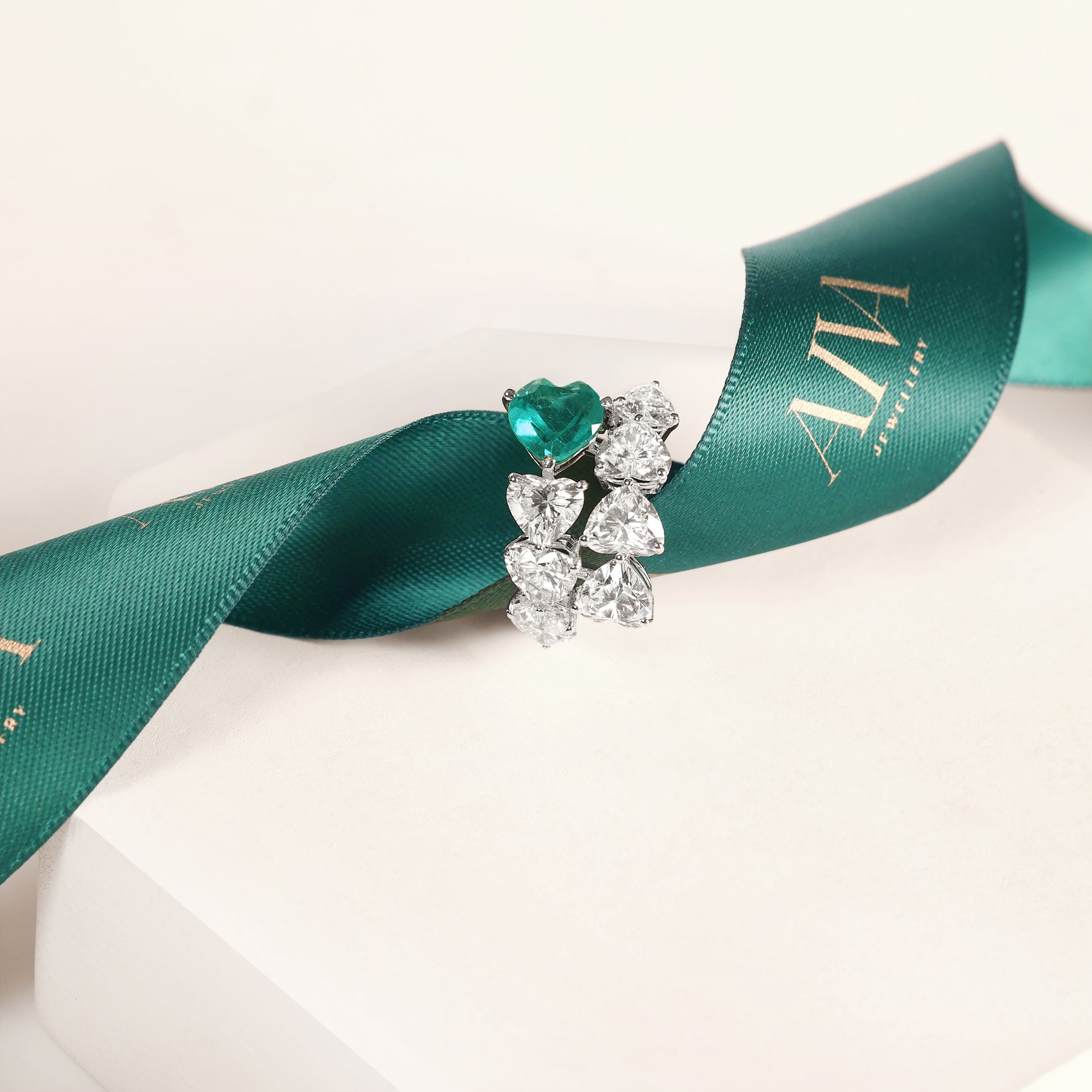 A harmonious dance of hearts, this enchanting ring beautifully embodies the spirit of love. It features a heart shaped lab grown emerald, complemented by an elegant cascade of heart shaped lab grown diamonds. The design masterfully balances symmetry with emotion, creating a truly romantic statement.