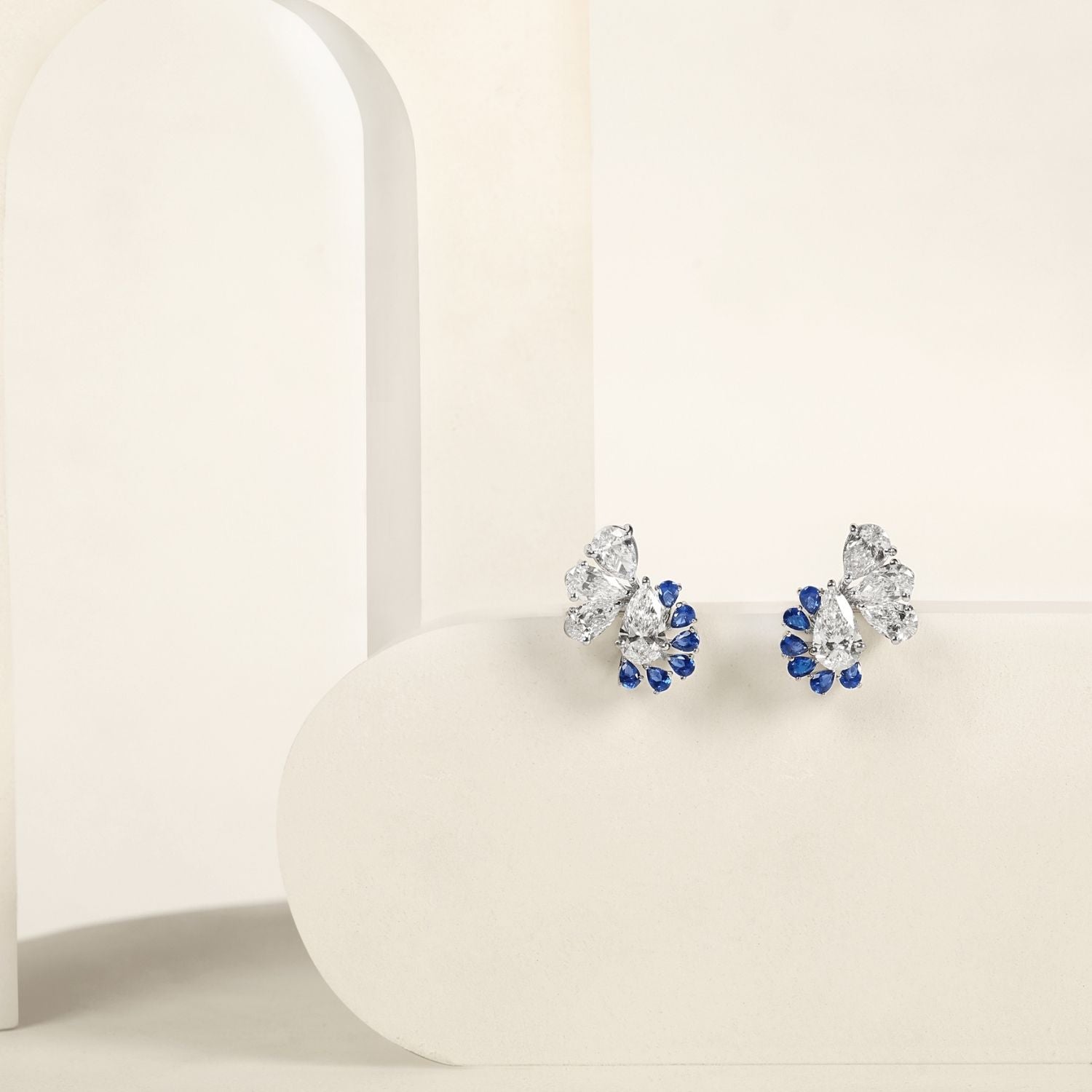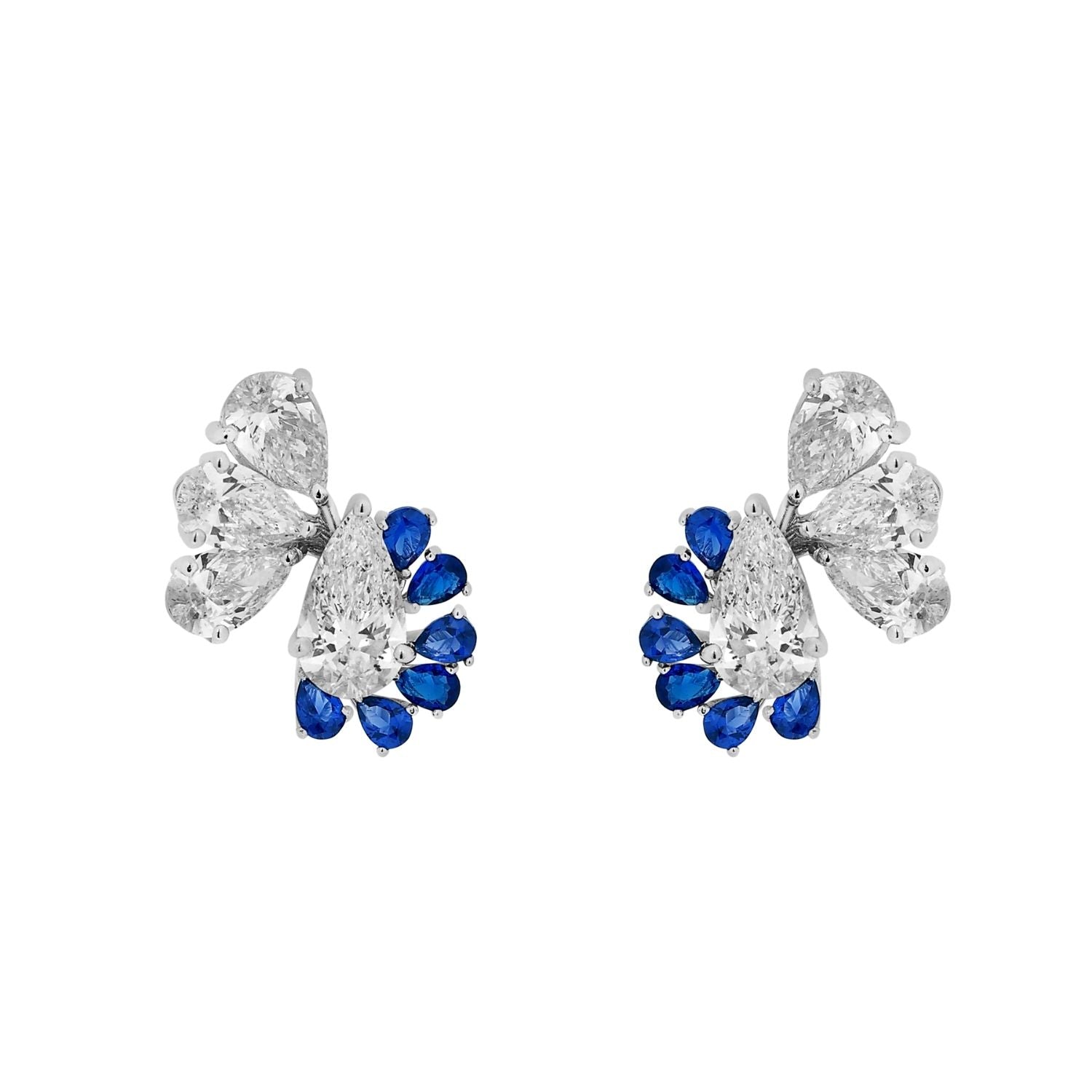 These unique and beautiful diamond studs feature an unconventional yet graceful design, giving a beautiful illusion of fluttering wigns. On one side of the studs, stands a captivating boundary of lab grown sapphires creating a striking contrast between the deep, rich blue of the sapphires and the radiant sparkle of the lab grown diamond