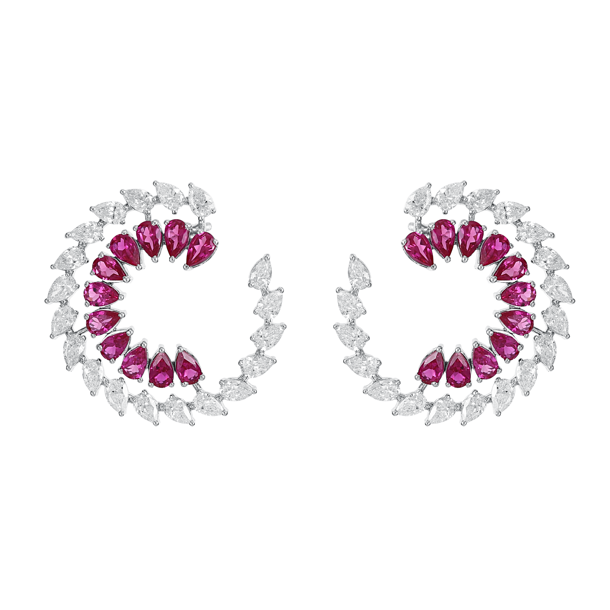These stunning statement earrings are a perfect blend of crimson ruby and timeless diamonds, creating a colour pop, set gracefully in a spiral setting.