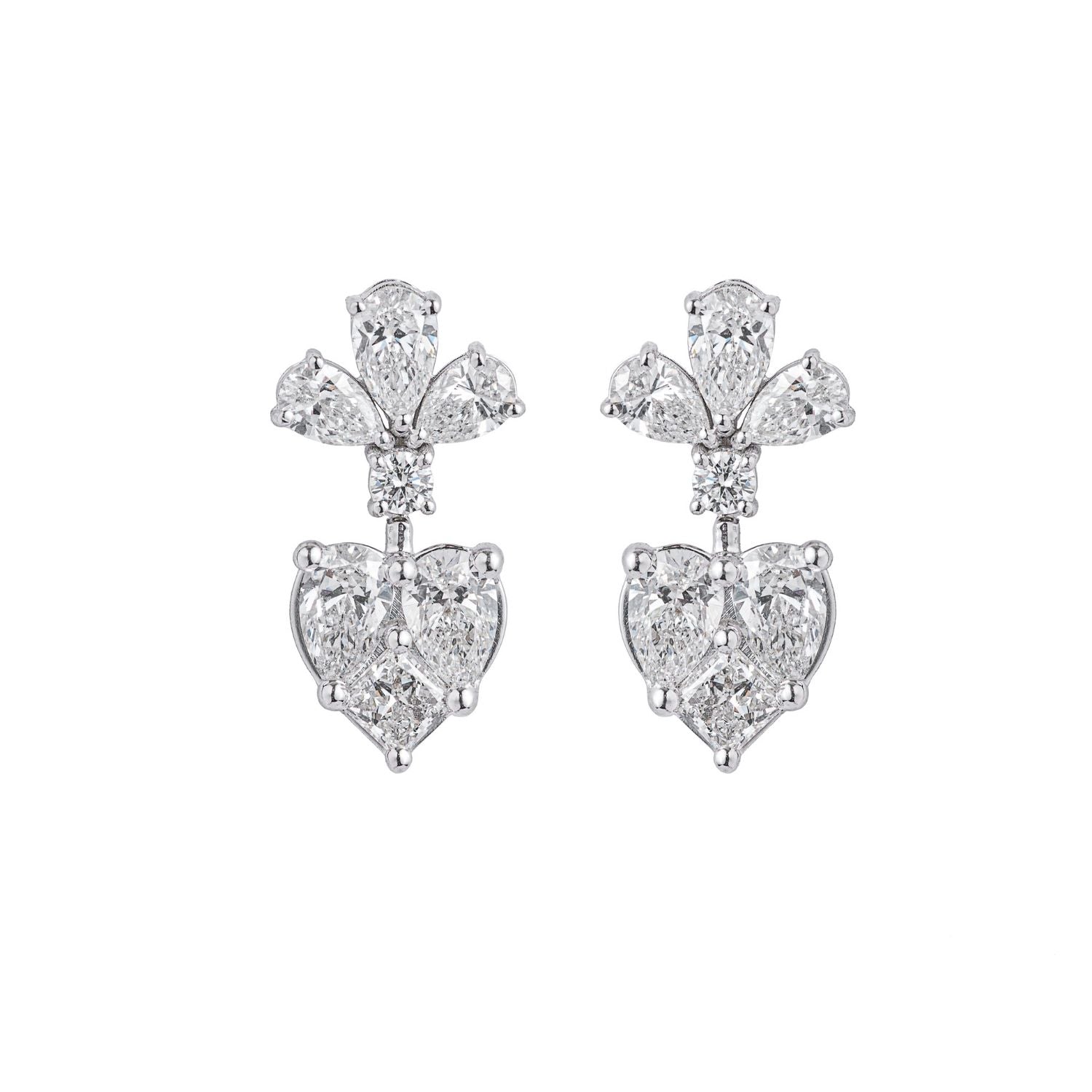 These stunning earrings are meticulously designed to showcase exquisite brilliance and charm. Featuring 3 pear shaped diamonds on top, this beautiful piece is suspended with 2 pear shaped diamonds and a princess cut carefully set together to curate a heart shaped motif. Combining both shapes creates a dynamic interplay that enchants from every angle.