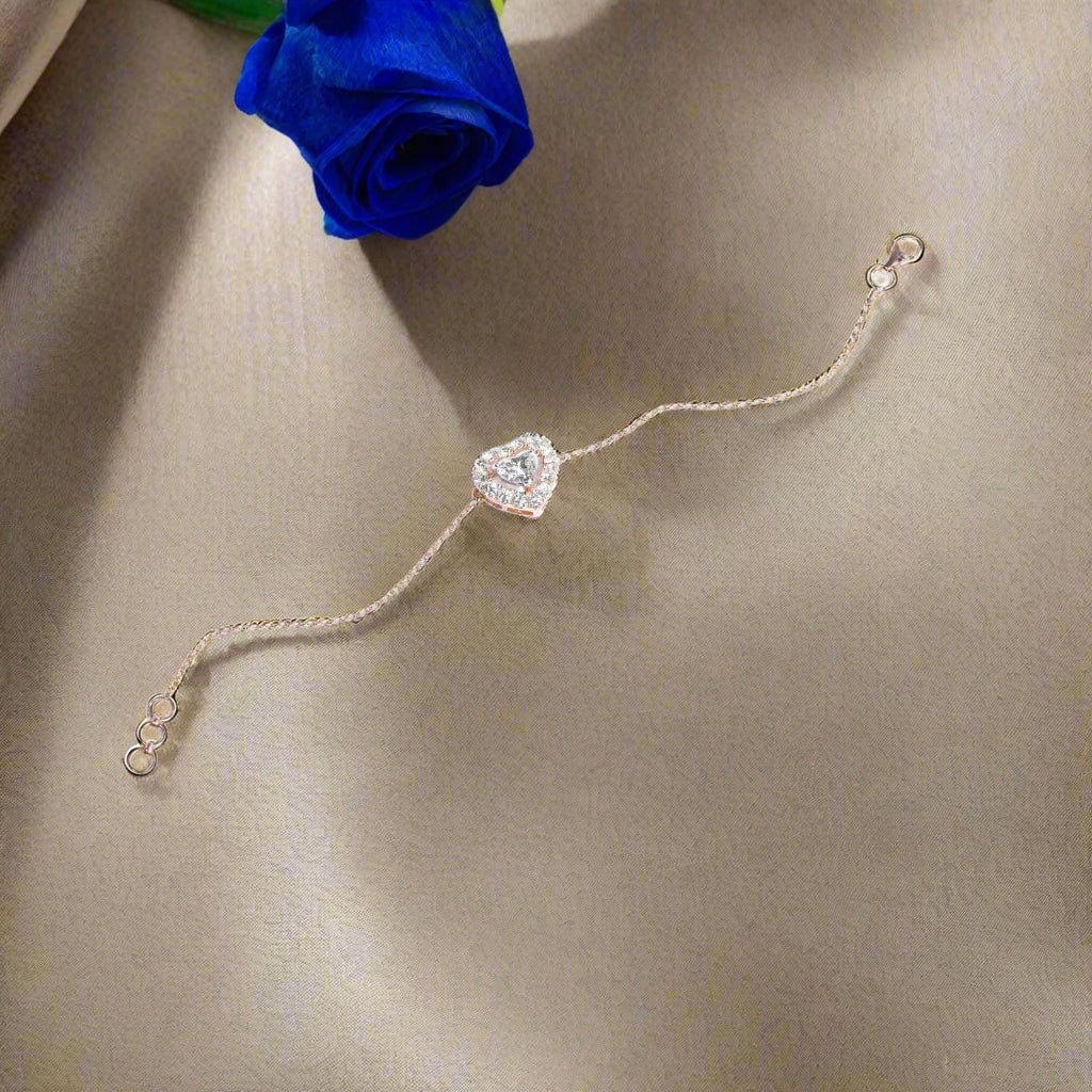 This classic masterpiece consists of a heart shaped solitaire surrounded by star mele and supported by a delicate chain that will sit perfectly on your wrist