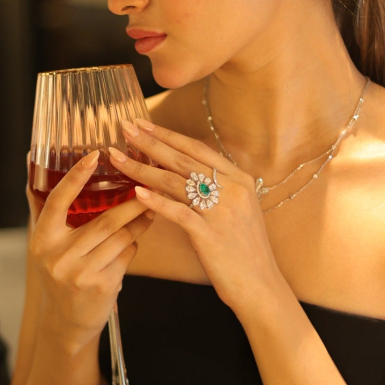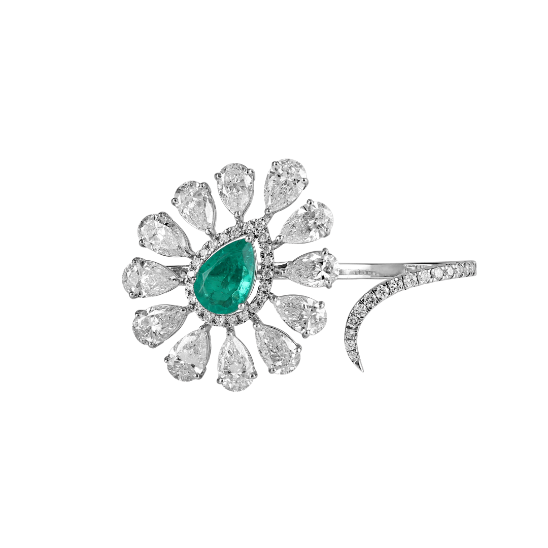 A bold take on floral elegance, this two-finger ring features a rich green, pear shaped lab grown emerald, encircled by a cluster of pear shaped lab grown diamonds, resembling a blooming flower. Complementing it is a gracefully curved diamond band that rests elegantly on the neighboring finger, creating a bold and captivating statement piece.