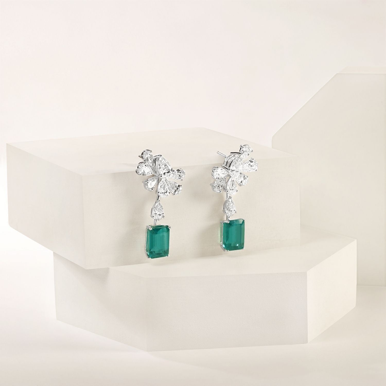 These exquisite diamond danglers showcase a mesmerizing design, highlighted by a meticulously crafted diamond setting at the base, forming a refined and intricate pattern. Hanging from this elegant foundation is a dazzling emerald cut lab-grown emerald. Its vibrant green hue adds a bold and captivating touch to this graceful and elegant pair.