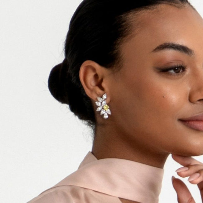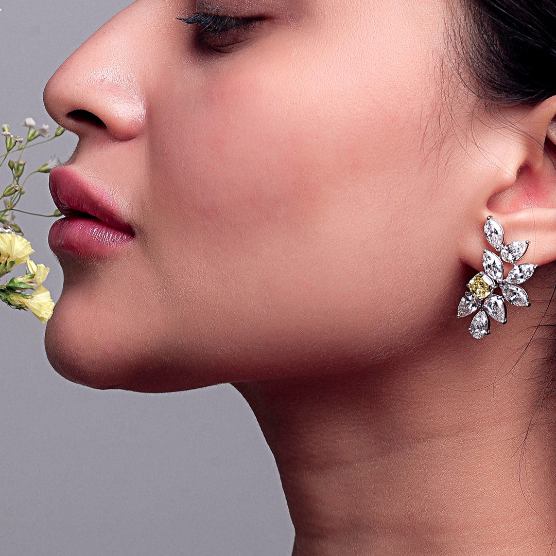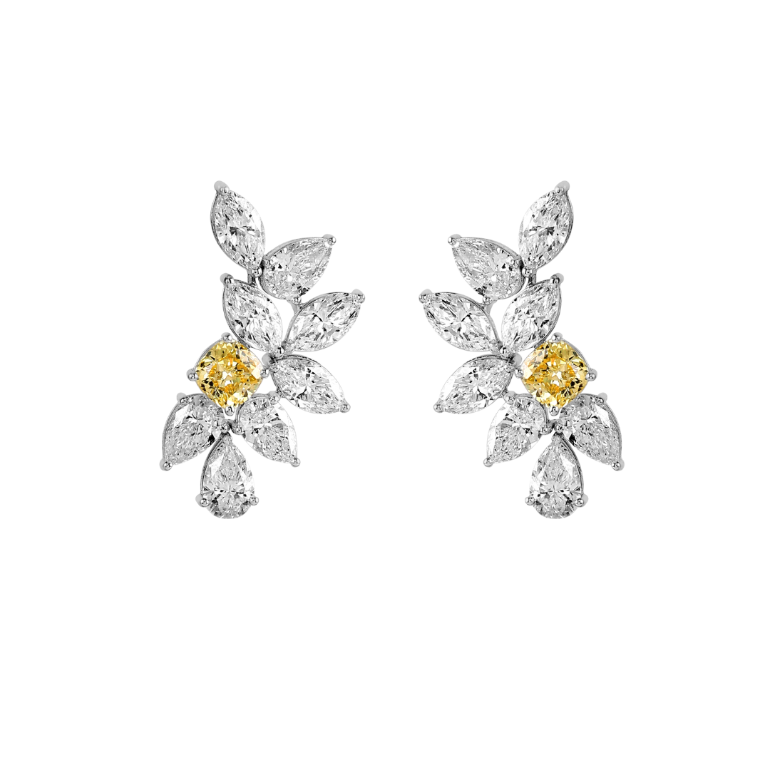 These earrings feature a vivid yellow diamond center surrounded by marquise-cut lab-grown diamonds, arranged in a graceful floral motif.