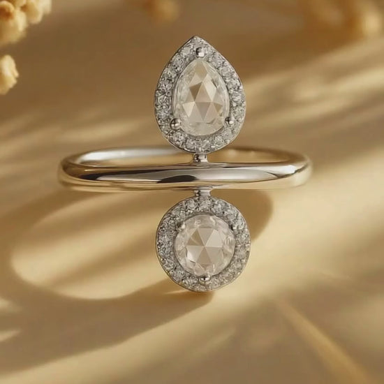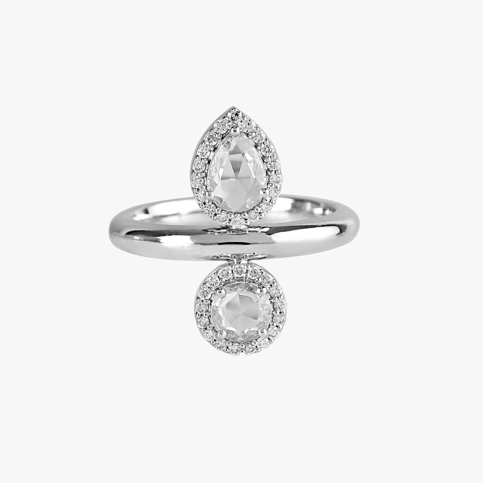 Crafted in white gold, this ring features a band with two exclusively cut rose cut lab grown diamonds, one round and one pear shaped, each encircled in halo of diamonds set in pave, glistening like stars meeting on a silver horizon