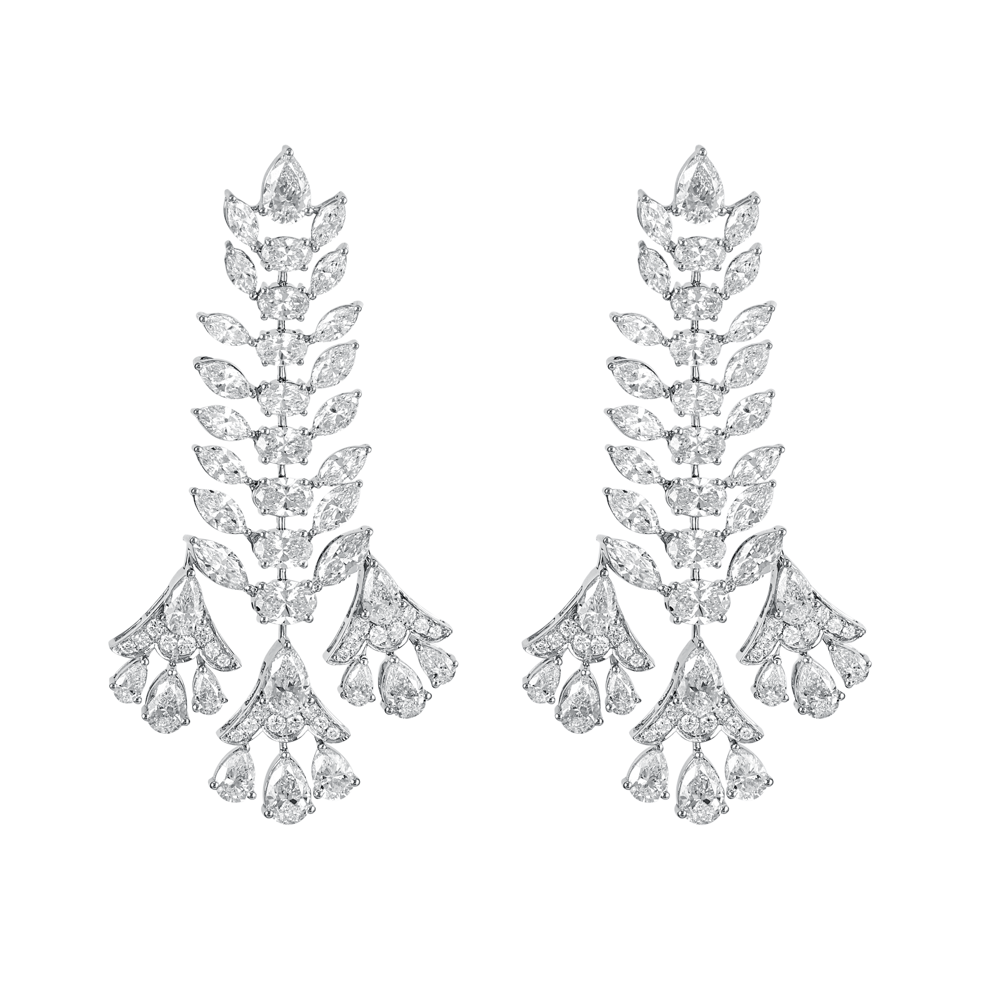 These stunning earrings drive design inspiration from cascading leaf pattern, adorned with sparking marquese cut diamonds, perfect for festive occasions or evening gala.