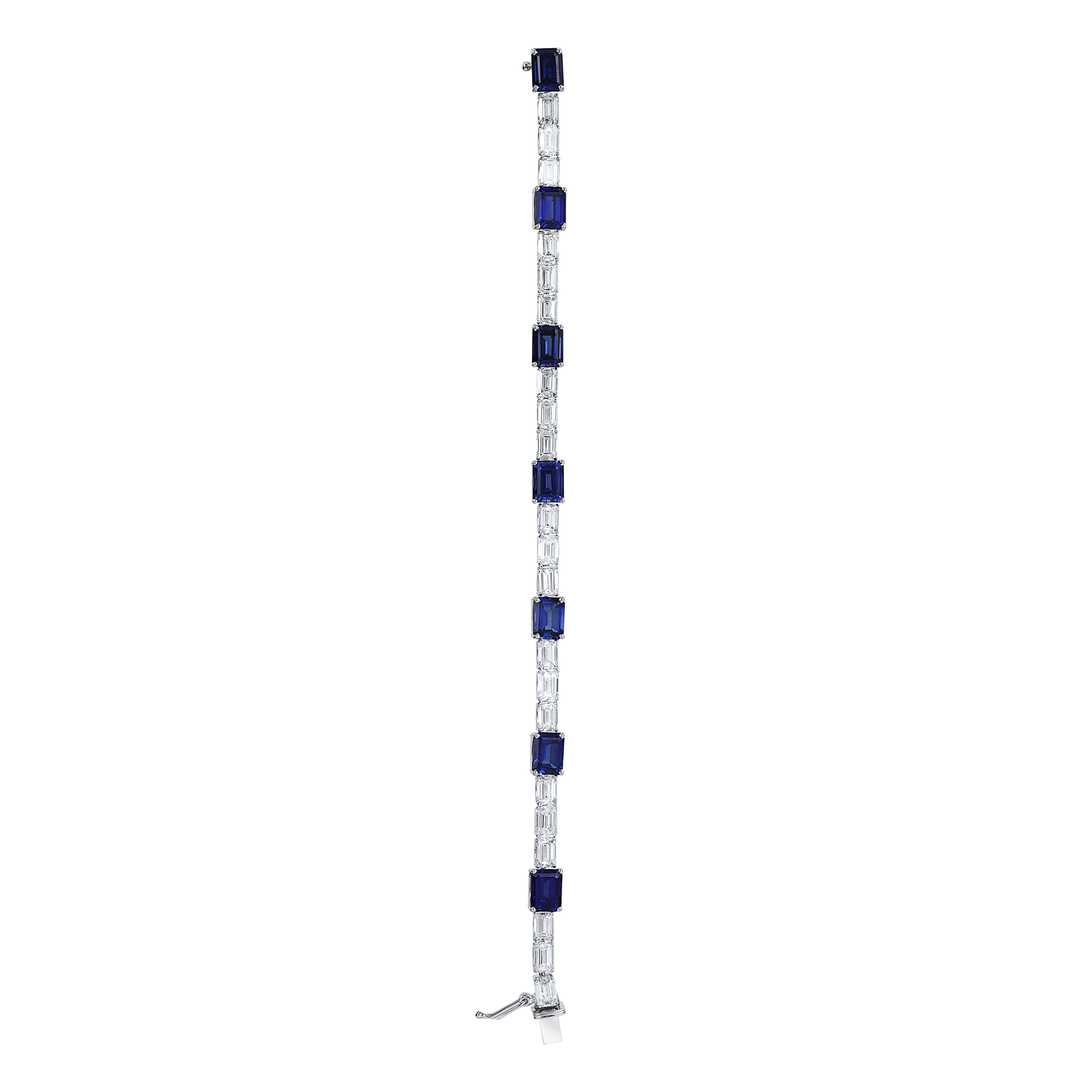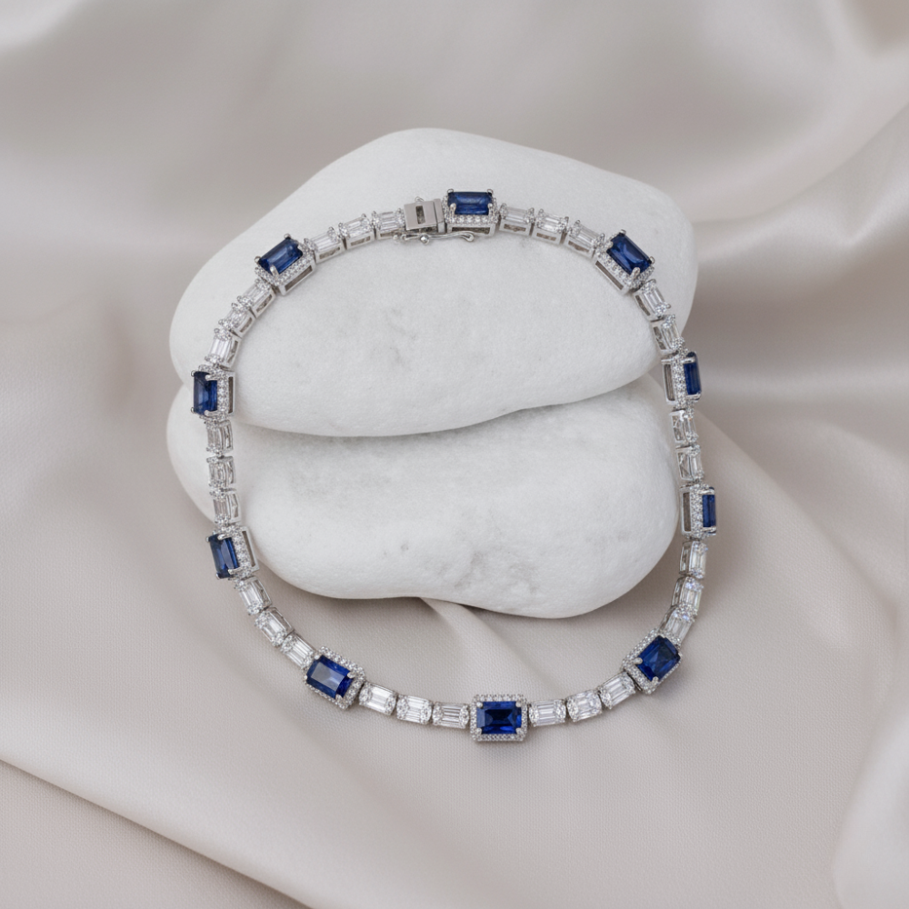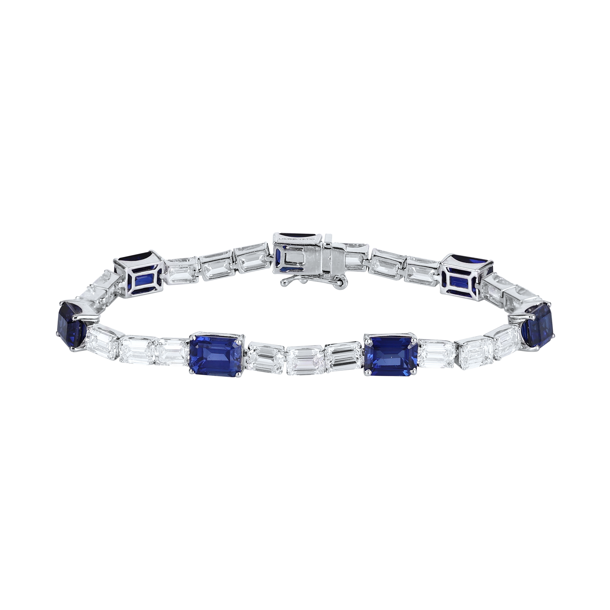 This bracelet features alternate deep blue sapphires and diamonds set in a sleek, geometric design creating an elegant contrast bringing a touch of luxury with modern charm