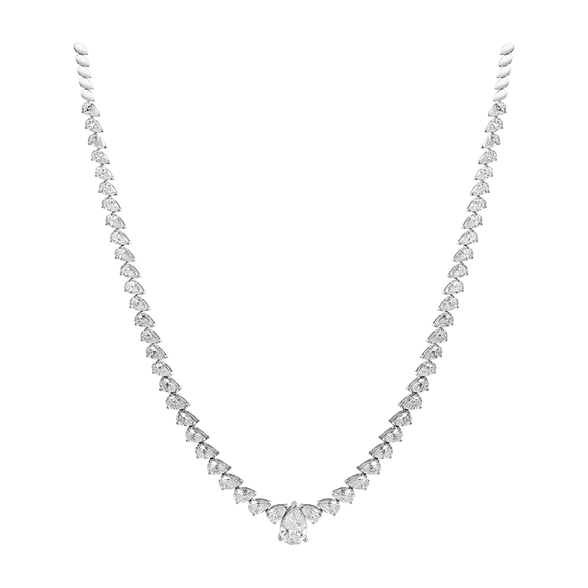 A timeless, elegant necklace string with teardrop-shaped diamonds set in a beautifully aligned arrangement, featuring a solitaire at its heart, is perfect for a soft, delicate look.