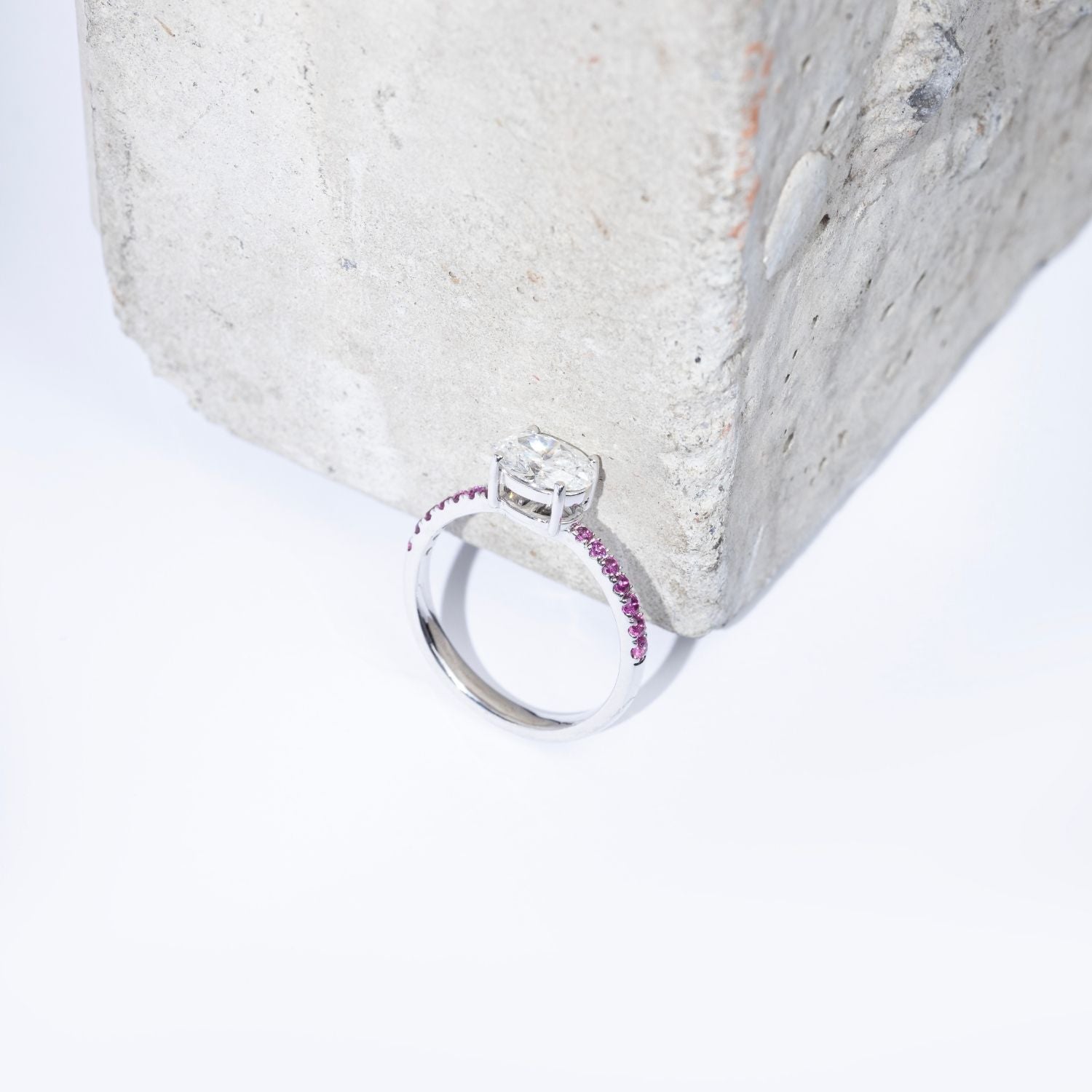 This dainty ring features an elegant oval cut lab-grown solitaire set on a base of beautiful coloured stones. It signifies simplicity and grace.