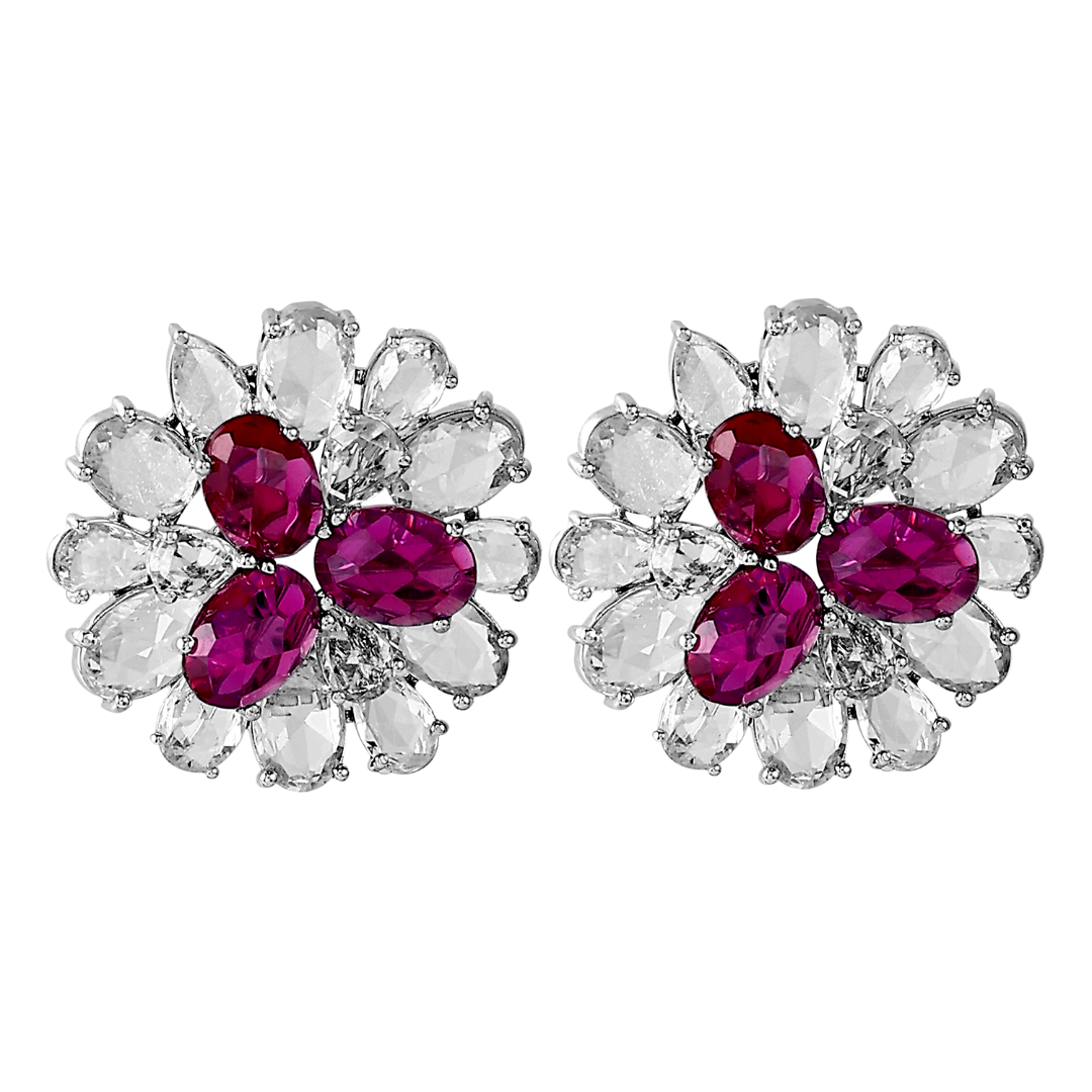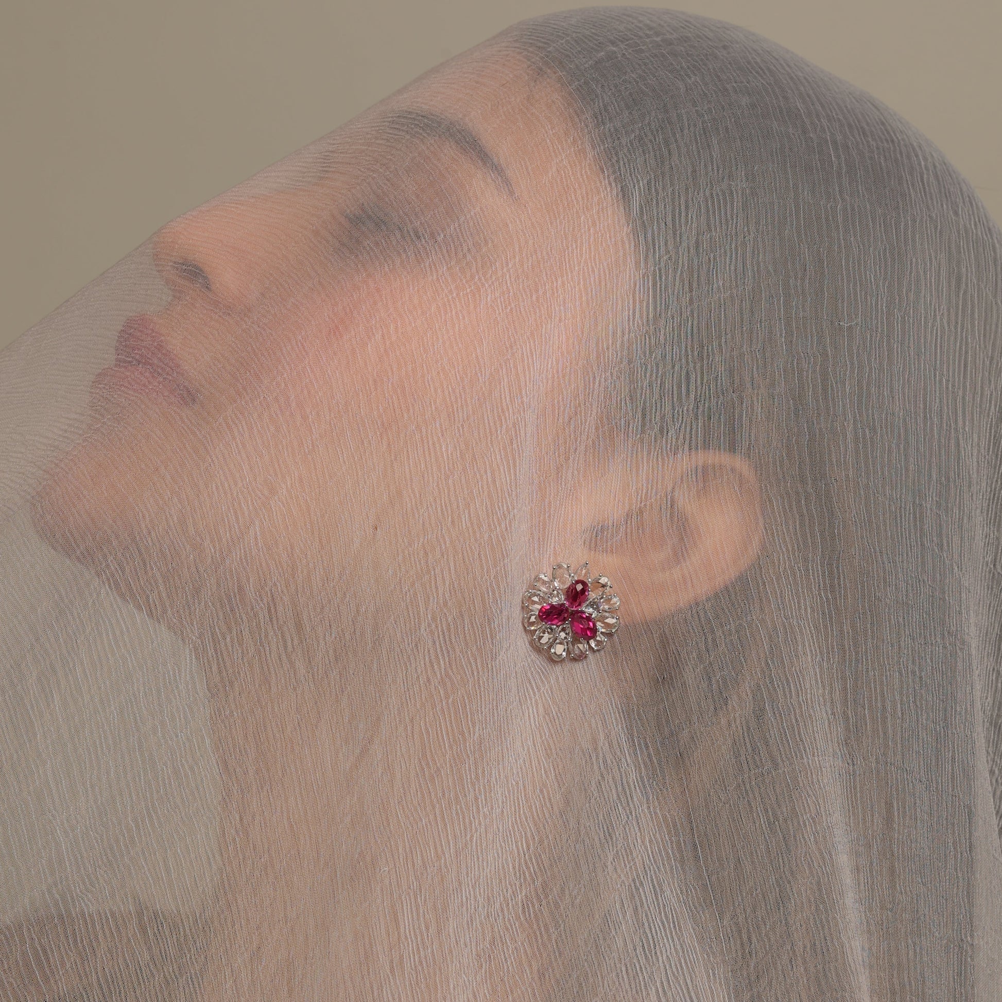 The exquisite floral stud earrings feature vibrant rubies at the center, surrounded by a halo of dazzling lab-grown rose-cut diamonds. The rubies are masterfully cut in a briolette shape to form a symmetrical three-petal flower, while the rose-cut diamonds encircle them in a delicate, shimmering floral design. Set in white gold, these earrings blend timeless charm with ethical luxury.