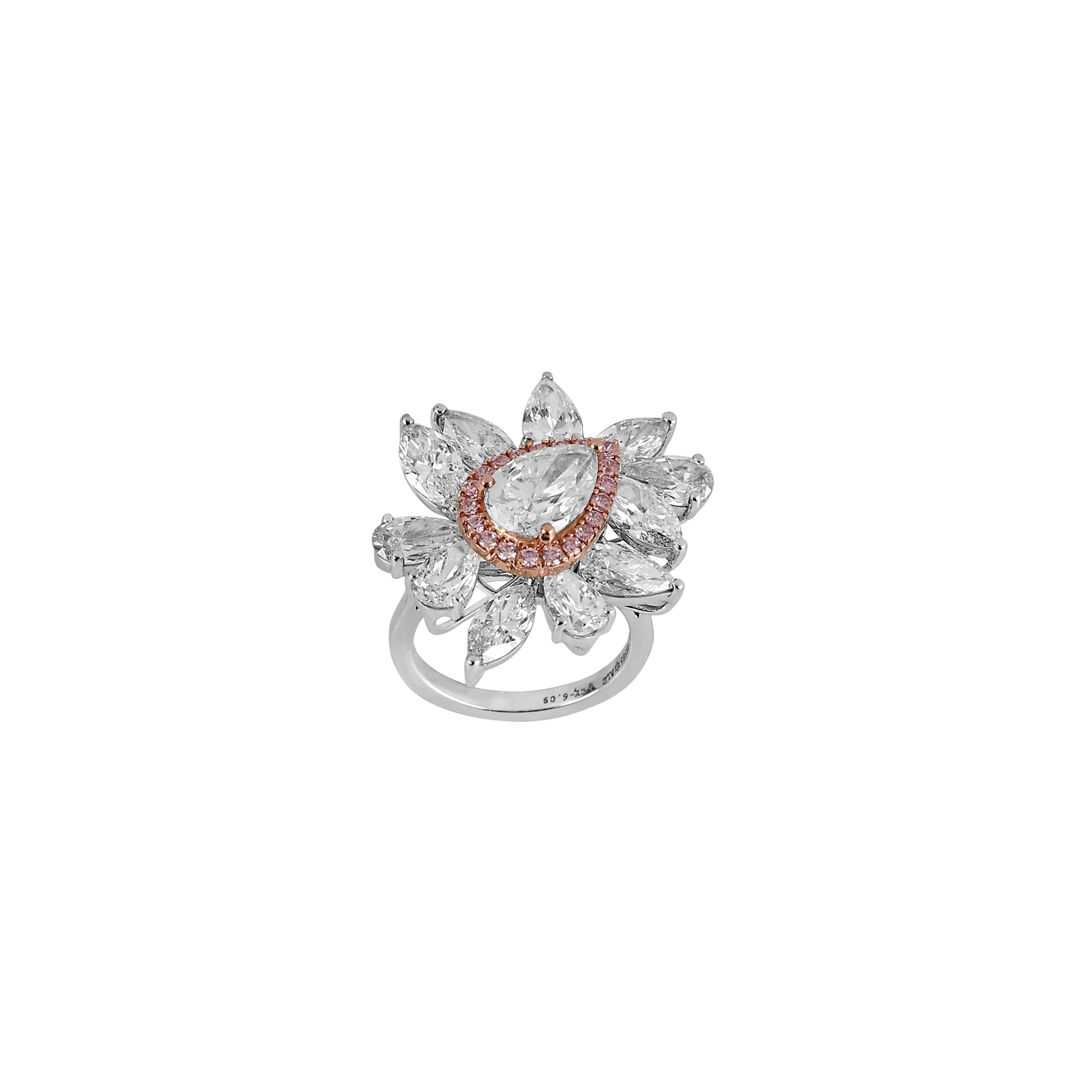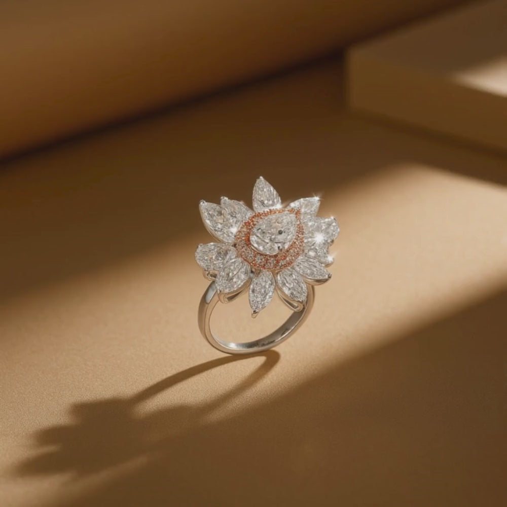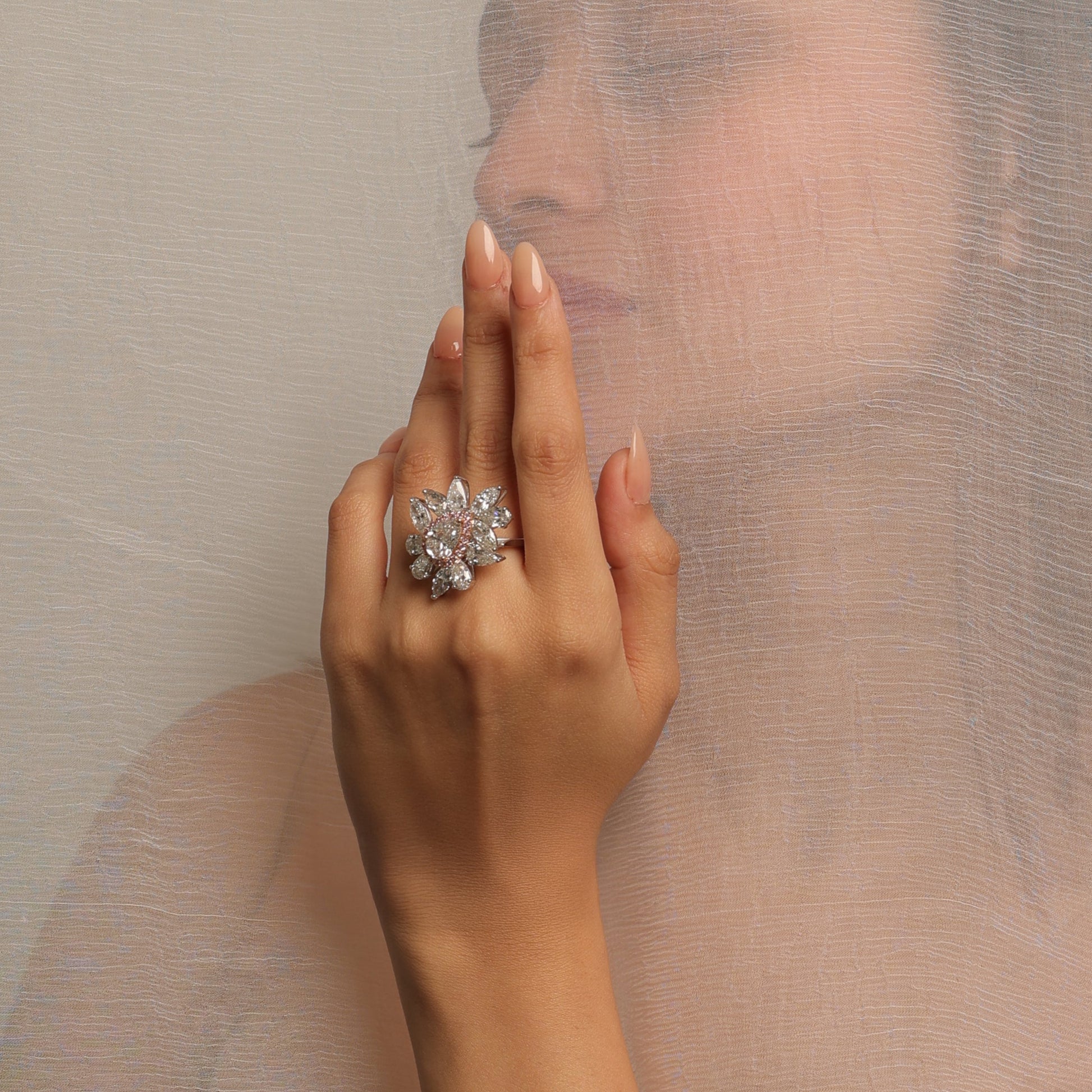 This striking statement ring showcases a bold floral silhouette, beautifully adorned with a cluster of glistening lab-grown rose-cut diamonds. Marquise and pear shaped diamonds form intricate petal like layers that bloom outward from a pear shaped center, framed by a delicate halo of blush pink diamonds. This piece is a timeless charm, reimagined with a modern edge.