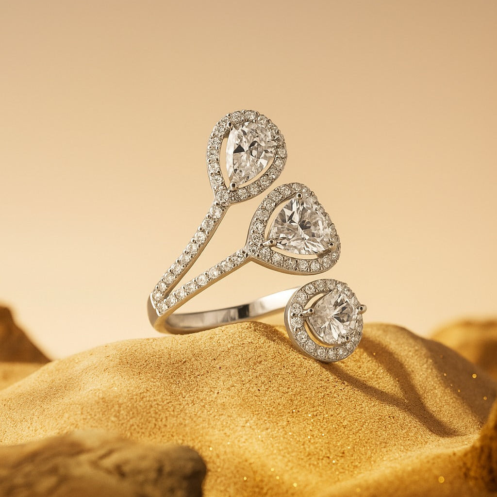 Showcasing a fluid swirl design, this ring features three beautiful 1 carat lab grown diamonds in pear, heart, and round cuts. Each stone is encircled by a pavé diamond halo, adding depth and sparkle. Asymmetrical yet harmonious, it’s a bold, contemporary piece that exudes elegance and individuality.